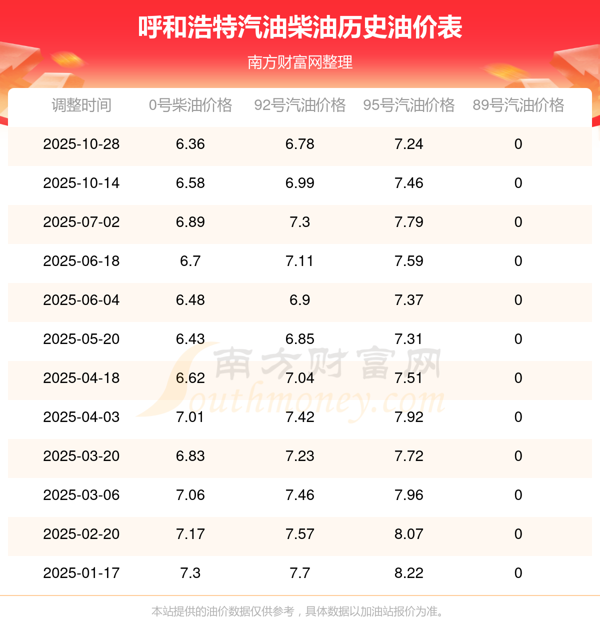 呼和浩特汽油、柴油11月8日每升的價(jià)格為10月28日調(diào)整后的價(jià)格,具體油價(jià)為:92號(hào)汽油6.78元;95號(hào)汽油7.24元;0號(hào)柴油6.36元。