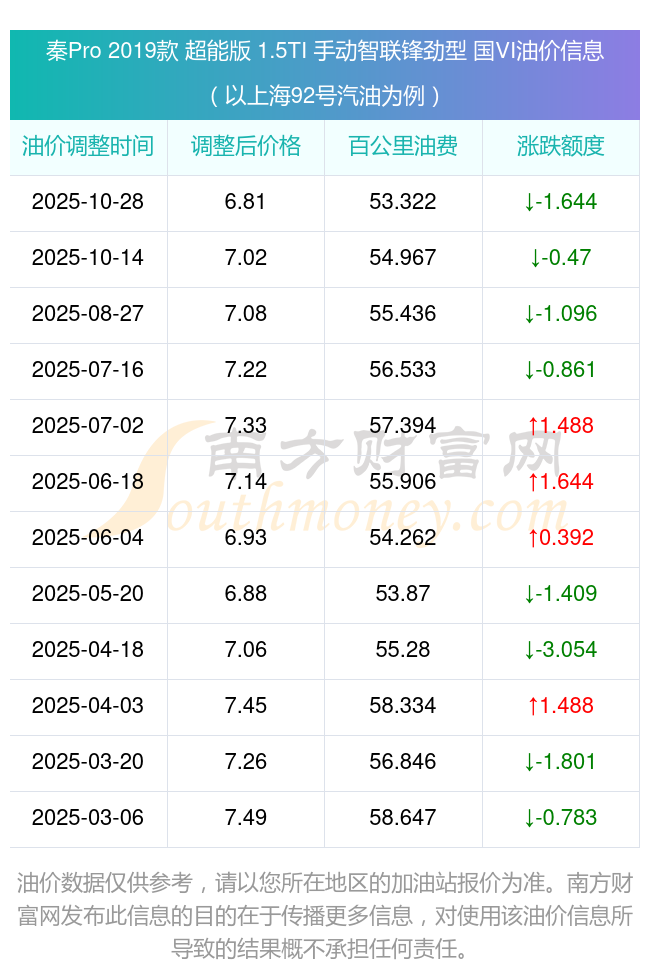 依照10月28日92號汽油最新調(diào)整價格6.81元/升來計算(以上海為例),該車型百公里的平均油費(fèi)是53.322元,依照上一輪10月14日調(diào)整價格7.02元/升來計算,百公里的平均油費(fèi)是54.967元,對比上一輪少花1.644元,下一輪的油價調(diào)整時間11月10日24時。