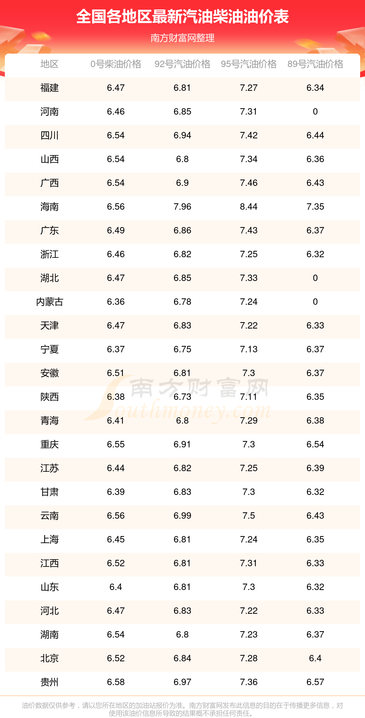 以上數(shù)據(jù)僅供參考,請(qǐng)以您所在地區(qū)的加油站實(shí)際售價(jià)為準(zhǔn)。南方財(cái)富網(wǎng)發(fā)布此信息的目的在于傳播更多信息,對(duì)使用該油價(jià)信息所導(dǎo)致的結(jié)果概不承擔(dān)責(zé)任。