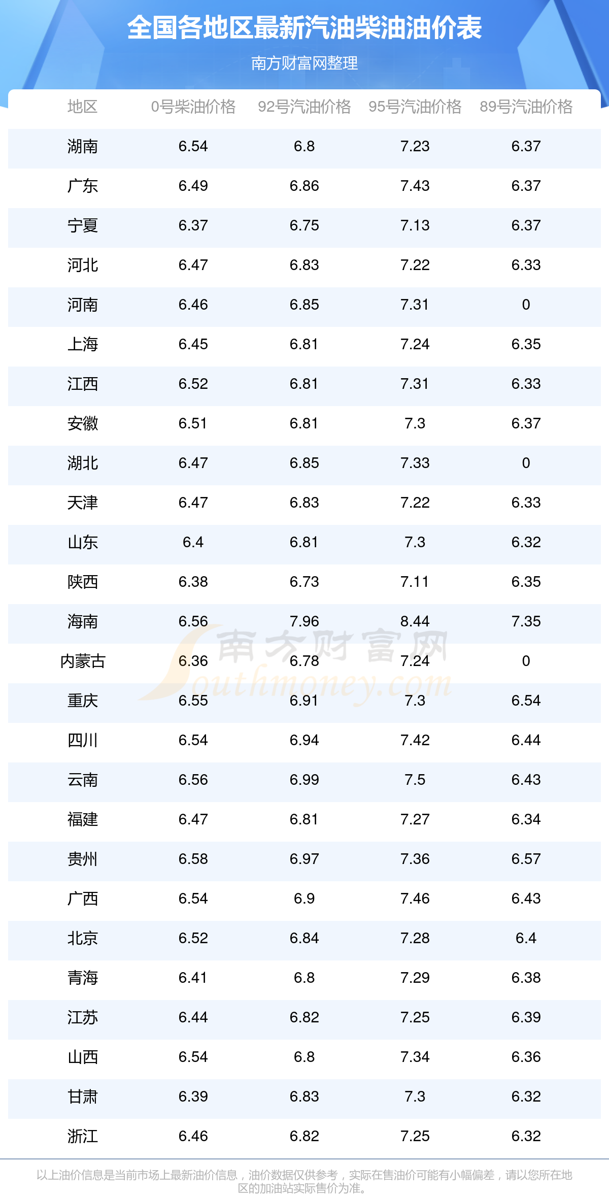全國(guó)各地區(qū)2025年最新汽油價(jià)格表