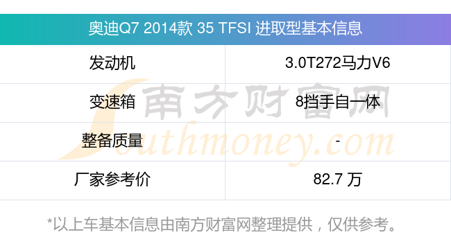 奧迪Q7 2014款 35 TFSI 進(jìn)取型搭載了一臺(tái)3.0T272馬力V6機(jī)械增壓發(fā)動(dòng)機(jī),采用8擋手自一體自動(dòng)檔變速箱,廠家參考價(jià)82.7萬(wàn)元。