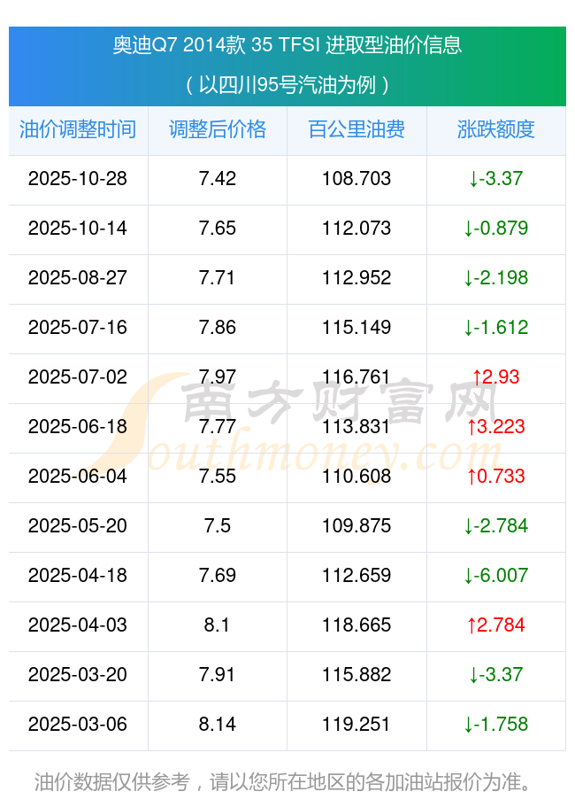按照10月28日95號(hào)汽油最新調(diào)整價(jià)格7.42元/升來(lái)計(jì)算(以四川為例),該車型百公里平均油費(fèi)為108.703元,按照上一輪10月14日調(diào)整價(jià)格7.65元/升來(lái)計(jì)算,百公里平均油費(fèi)為112.073元,對(duì)比上一輪少花3.37元,下一輪油價(jià)調(diào)整時(shí)間為11月10日24時(shí)。