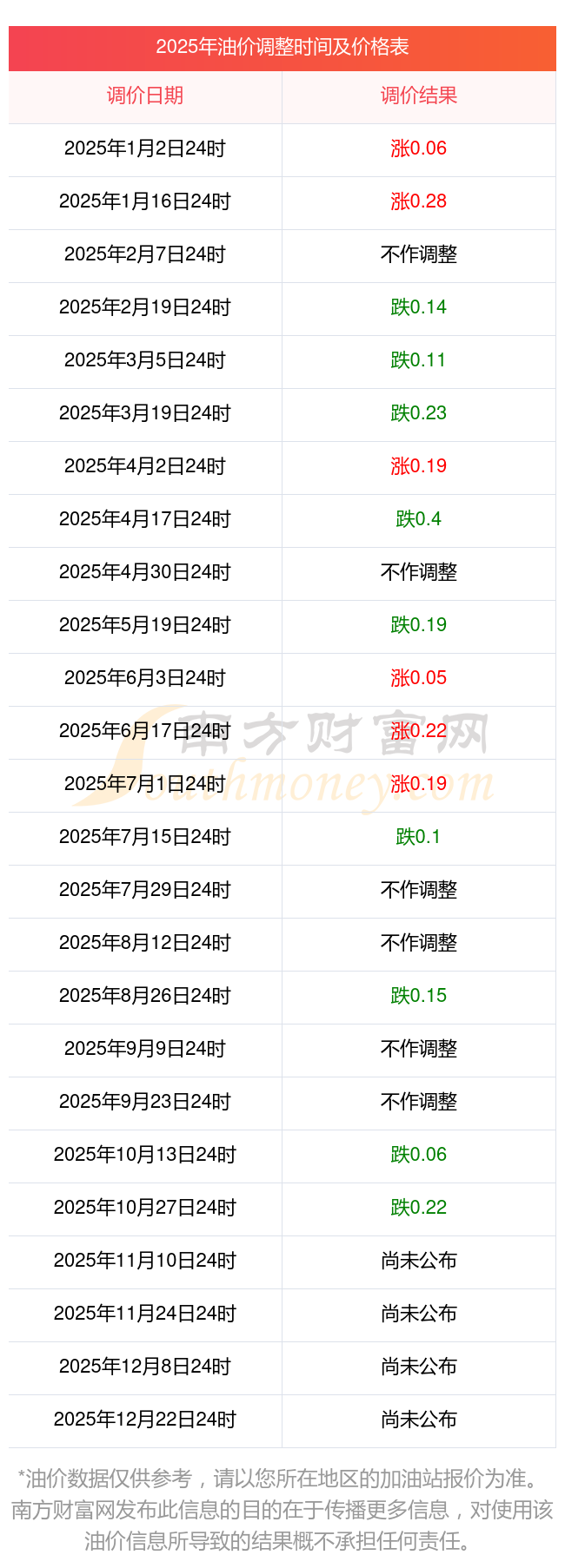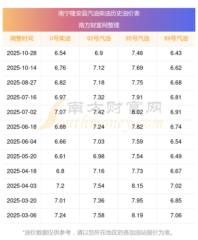 油價調整最新消息:下一輪油價調整時間11月10日24時。11月8日南寧隆安縣汽油柴油每升價格(10月28日調整后的價格):92號汽油為6.9元,降了0.22元,降幅達3.09%;95號汽油為7.46元,降了0.23元,降幅達2.99%;89號汽油為6.43元,降了0.19元,降幅達2.87%;0號柴油為6.54元,降了0.22元,降幅達3.25%。