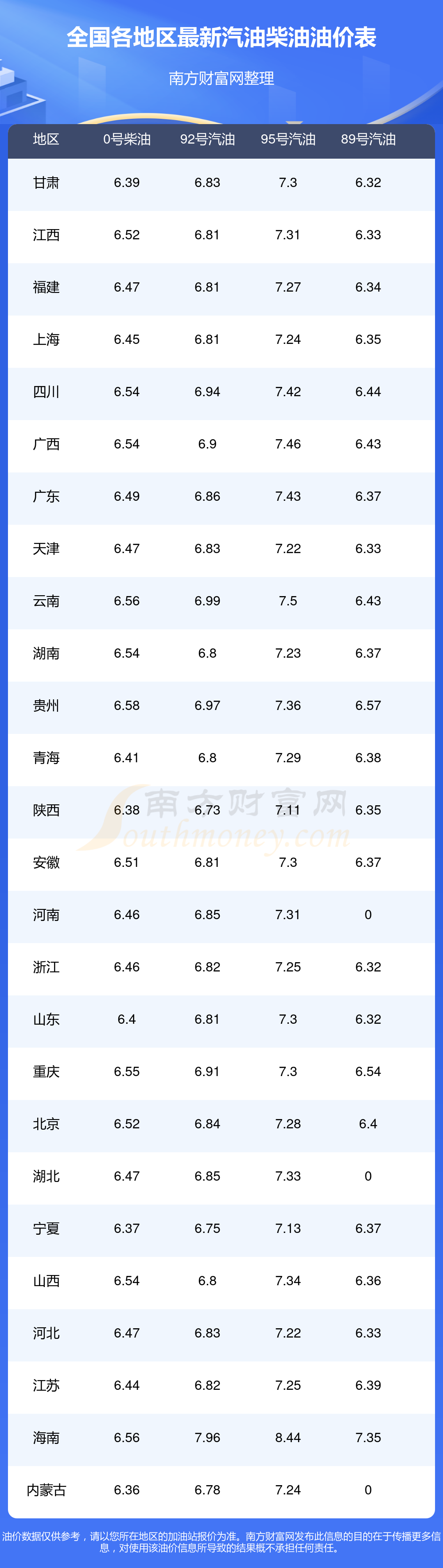 全國(guó)各地區(qū)2025年最新油價(jià)表
