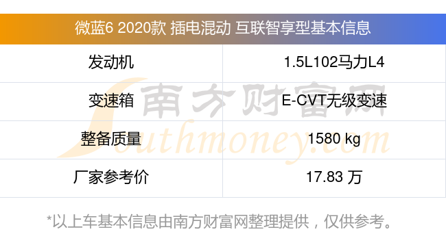 微藍(lán)6 2020款 插電混動(dòng) 互聯(lián)智享型動(dòng)力方面,搭載的是一臺(tái)1.5L102馬力L4自然吸氣發(fā)動(dòng)機(jī),匹配E-CVT無(wú)級(jí)變速自動(dòng)檔變速箱,燃料形式為插電式混合動(dòng)力,常規(guī)整備質(zhì)量1580kg,廠家參考價(jià)17.83萬(wàn)元。