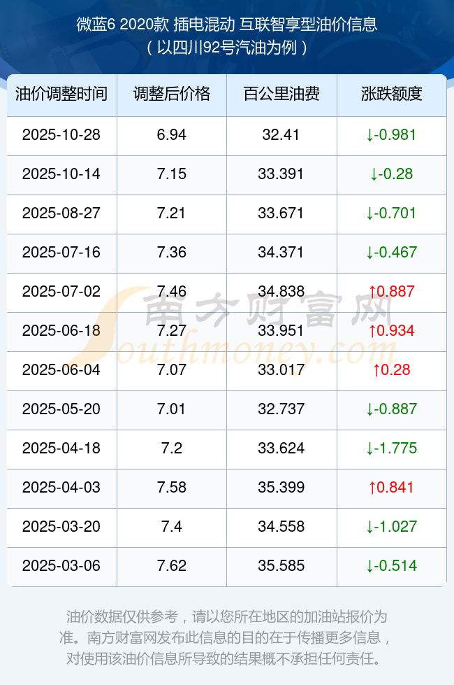 按10月28日92號(hào)汽油最新調(diào)整價(jià)格6.94元每升來(lái)計(jì)算(以四川為例),該車型百公里平均油費(fèi)為32.41元,按上一輪10月14日調(diào)整價(jià)格7.15元每升來(lái)計(jì)算,百公里平均油費(fèi)為33.391元,對(duì)比上一輪少花0.981元,下一輪油價(jià)調(diào)整時(shí)間為11月10日24時(shí)。
