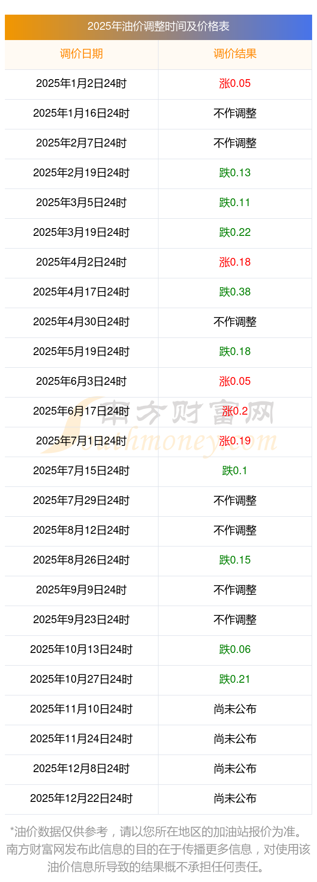 油價調整最新消息:11月8日陜西汽油、柴油每升的價格為10月28日調整后的價格,92號汽油為6.73元,跌了0.21元,跌幅達3.03%;95號汽油為7.11元,跌了0.23元,跌幅達3.13%;89號汽油為6.35元,跌了0.2元,跌幅達3.05%;0號柴油為6.38元,跌了0.22元,跌幅達3.33%。下一輪油價調整時間11月10日24時。