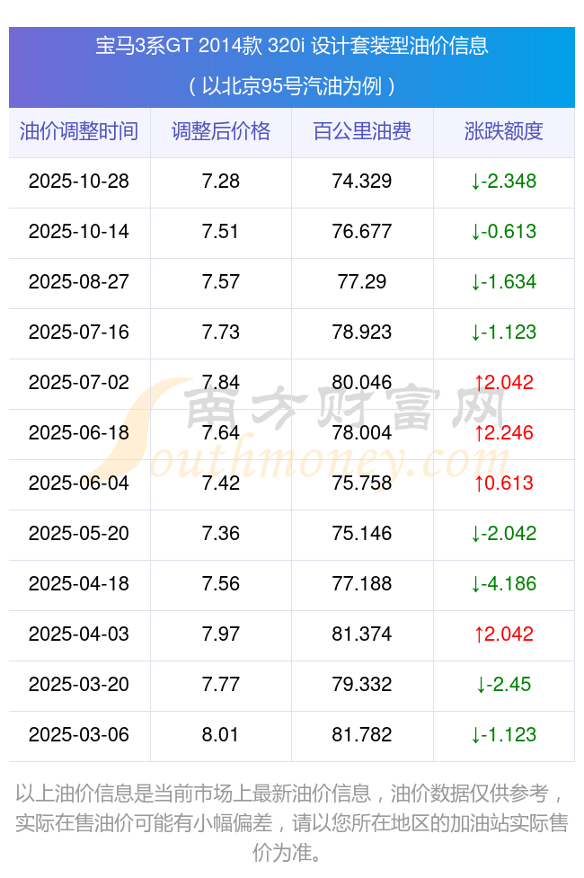 根據10月28日95號汽油最新調整價格7.28元/升來計算(以北京為例),該車型每百公里的平均油費是74.329元,上一輪10月14日調整價格7.51元每升來計算,每百公里的平均油費是76.677元,對比上一輪少花2.348元,下一輪的油價調整時間是11月10日24時。
