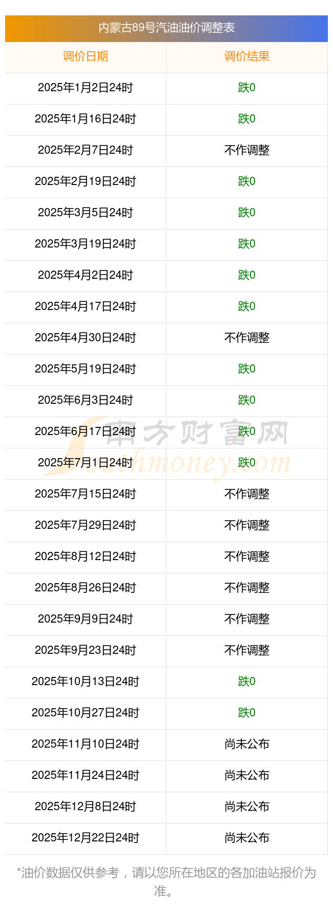 11月8日呼和浩特汽油、柴油每升價格:距離最近的油價調(diào)整時間是10月28日,92號汽油為6.78元,下調(diào)了0.21元,下調(diào)幅達3%;95號汽油為7.24元,下調(diào)了0.22元,下調(diào)幅達2.95%;0號柴油為6.36元,下調(diào)了0.22元,下調(diào)幅達3.34%。呼和浩特下一輪油價調(diào)整時間11月10日24時,距離現(xiàn)在還有2.58天。