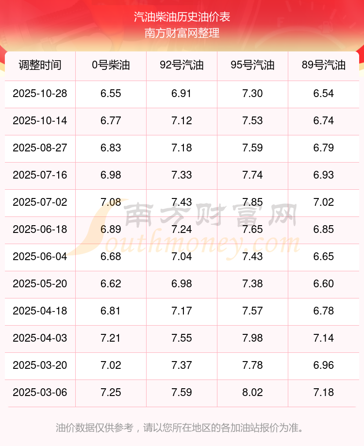 2025年95號(hào)汽油價(jià)格一覽表