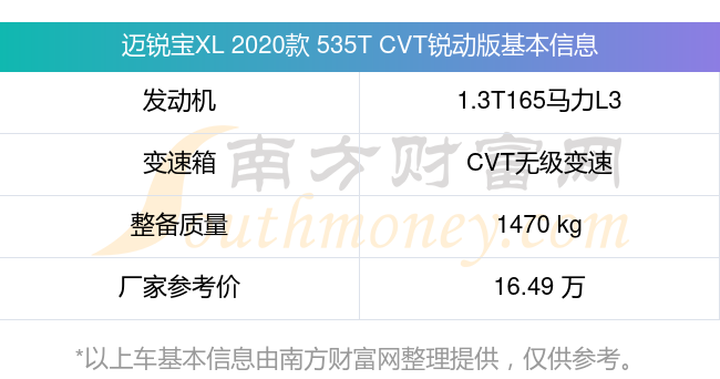 邁銳寶XL 2020款 535T CVT銳動(dòng)版動(dòng)力上搭載的是一臺(tái)1.3T165馬力L3渦輪增壓發(fā)動(dòng)機(jī),匹配CVT無級(jí)變速自動(dòng)檔變速箱,燃料形式為汽油,常規(guī)整備質(zhì)量1470kg,廠家參考價(jià)16.49萬元。