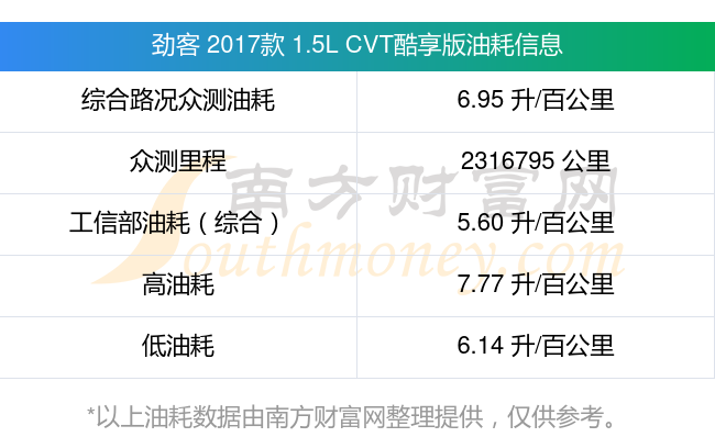 根據(jù)多位車主實(shí)測(cè)得出數(shù)據(jù),該車型低油耗為6.14升/百公里,高油耗為7.77升/百公里,綜合路況眾測(cè)油耗為6.95升/百公里,工信部綜合油耗為5.60升/百公里。