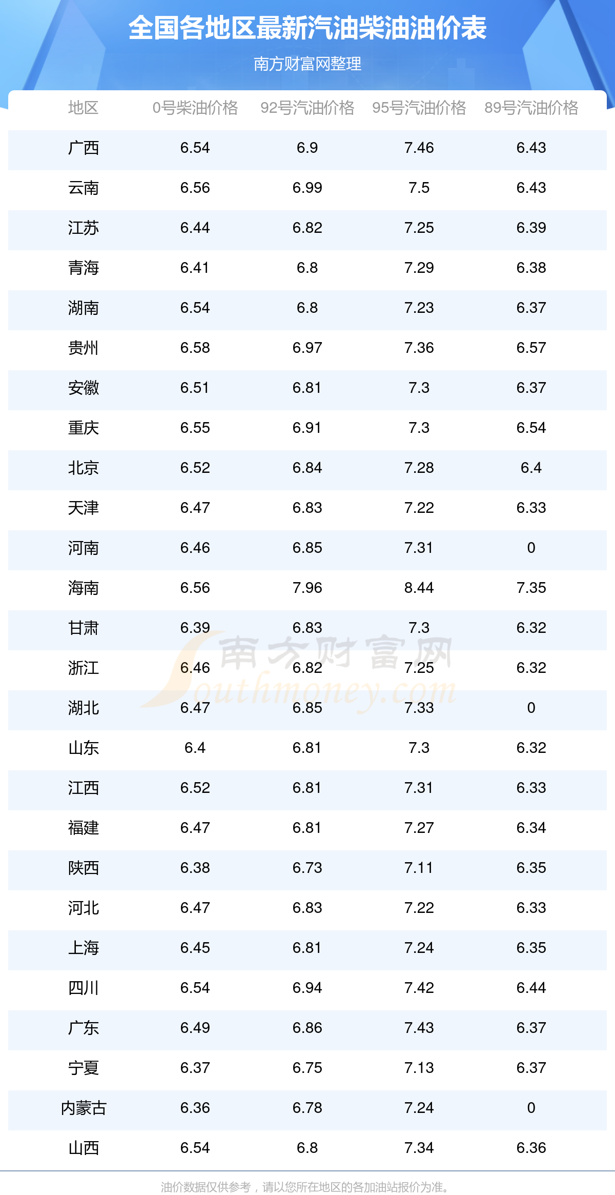 11月8日全國各地區(qū)汽油油價今日價格查詢?