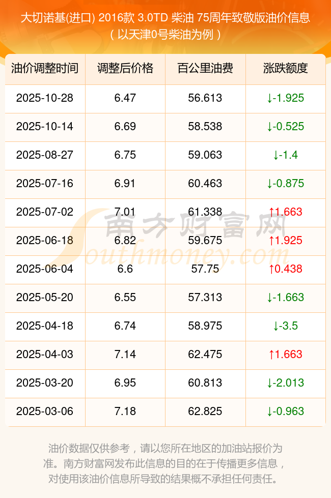 按照10月28日0號(hào)柴油最新調(diào)整價(jià)格6.47元/升來(lái)計(jì)算(以天津?yàn)槔?,該車(chē)型百公里平均油費(fèi)為56.613元,按照上一輪10月14日調(diào)整價(jià)格6.69元/升來(lái)計(jì)算,百公里平均油費(fèi)為58.538元,對(duì)比上一輪少花1.925元,下一輪油價(jià)調(diào)整時(shí)間為11月10日24時(shí)。