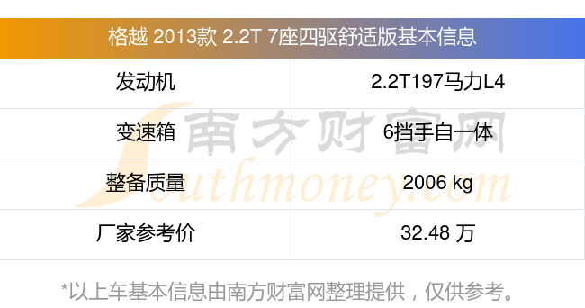 格越 2013款 2.2T 7座四驅(qū)舒適版動(dòng)力上配備的是一臺(tái)2.2T197馬力L4渦輪增壓發(fā)動(dòng)機(jī),匹配的是6擋手自一體自動(dòng)檔變速箱,燃料形式為柴油,常規(guī)整備質(zhì)量2006kg,廠家參考價(jià)32.48萬元。