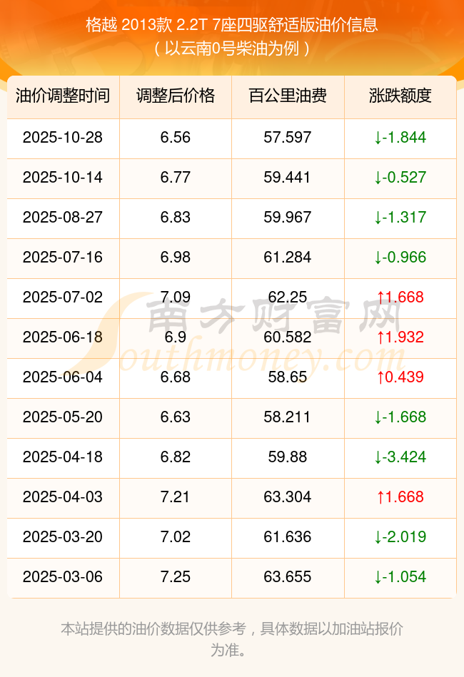 根據(jù)10月28日0號(hào)柴油最新調(diào)整價(jià)格6.56元/升來計(jì)算(以云南為例),該車型每百公里的平均油費(fèi)是57.597元,上一輪10月14日調(diào)整價(jià)格6.77元每升來計(jì)算,每百公里的平均油費(fèi)是59.441元,對(duì)比上一輪少花1.844元,下一輪的油價(jià)調(diào)整時(shí)間是11月10日24時(shí)。