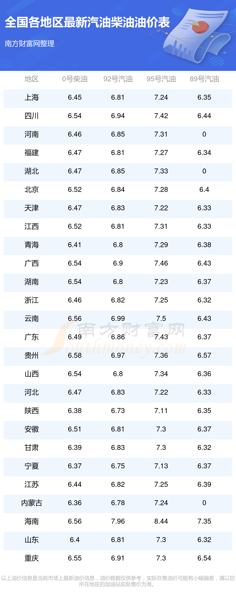 油價(jià)數(shù)據(jù)僅供參考,請(qǐng)以您所在地區(qū)的加油站報(bào)價(jià)為準(zhǔn)。南方財(cái)富網(wǎng)發(fā)布此信息的目的在于傳播更多信息,對(duì)使用該油價(jià)信息所導(dǎo)致的結(jié)果概不承擔(dān)任何責(zé)任。