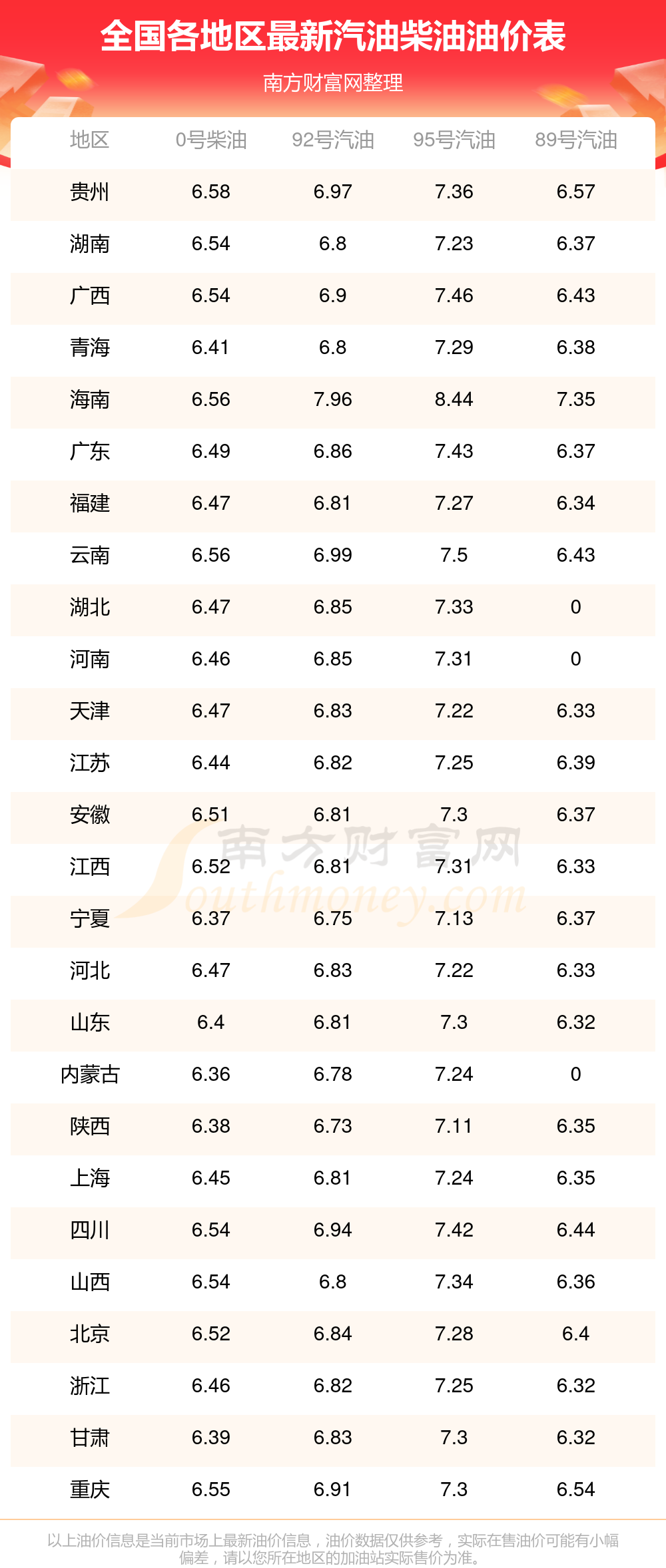 油價(jià)最新調(diào)整時(shí)間為10月28日,全國(guó)92號(hào)汽油最新平均價(jià)格為:7元每升,其中,最低為陜西,價(jià)格為6.73元/升,最高為海南,價(jià)格為7.96元/升。全國(guó)95號(hào)汽油最新平均價(jià)格為:7元每升,其中,最低為陜西,價(jià)格為7.11元/升,最高為海南,價(jià)格為8.44元/升。全國(guó)0號(hào)柴油最新平均價(jià)格為:6元每升,其中,最低為內(nèi)蒙古,價(jià)格為6.36元/升,最高為貴州,價(jià)格為6.58元/升。全國(guó)89號(hào)汽油最新平均價(jià)格為:6元每升,其中,最低為浙江,價(jià)格為6.32元/升,最高為海南,價(jià)格為7.35元/升。