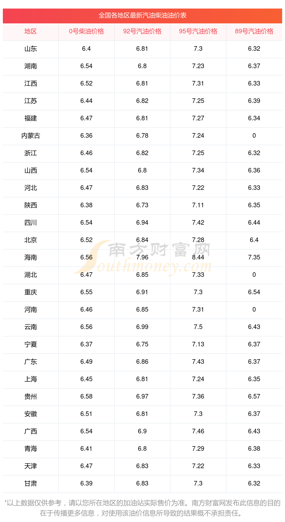 以上數(shù)據(jù)僅供參考,請(qǐng)以您所在地區(qū)的加油站實(shí)際售價(jià)為準(zhǔn)。南方財(cái)富網(wǎng)發(fā)布此信息的目的在于傳播更多信息,對(duì)使用該油價(jià)信息所導(dǎo)致的結(jié)果概不承擔(dān)責(zé)任。