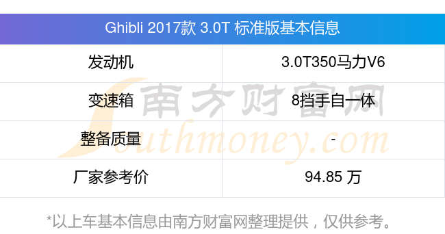 在動力上,Ghibli 2017款 3.0T 標準版配備的是一臺3.0T350馬力V6雙渦輪增壓發(fā)動機,匹配的是8擋手自一體自動檔變速箱,燃料形式為汽油,廠家參考價94.85萬元。