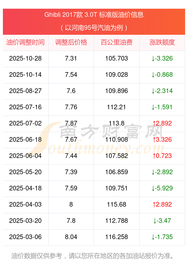根據(jù)10月28日95號汽油最新調(diào)整價格7.31元/升來計算(以河南為例),該車型每百公里的平均油費是105.703元,上一輪10月14日調(diào)整價格7.54元每升來計算,每百公里的平均油費是109.028元,對比上一輪少花3.326元,下一輪的油價調(diào)整時間是11月10日24時。