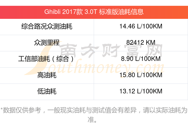 根據(jù)車主實測數(shù)據(jù),該車型低油耗為13.12升每百公里,高油耗為15.80升每百公里,綜合路況眾測油耗為14.46升每百公里,工信部綜合油耗為8.90升每百公里。