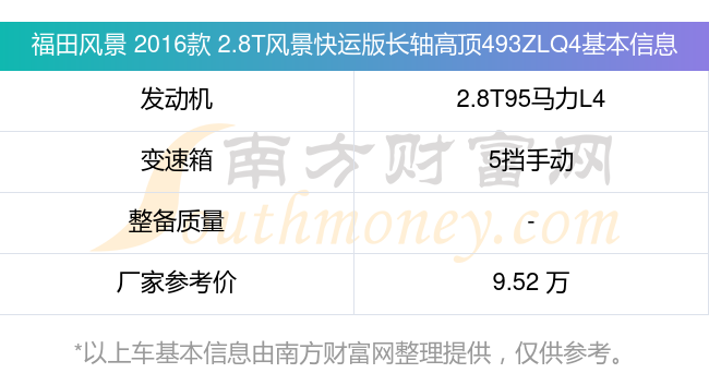 福田風(fēng)景 2016款 2.8T風(fēng)景快運(yùn)版長軸高頂493ZLQ4動力上搭載的是一臺2.8T95馬力L4渦輪增壓發(fā)動機(jī),匹配5擋手動擋變速箱,燃料形式為柴油,廠家參考價9.52萬元。