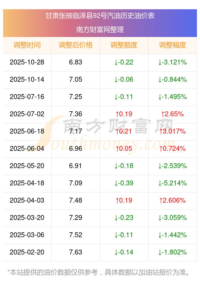 11月8日甘肅張掖臨澤縣92號汽油歷史油價一覽表