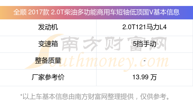 在動力方面,全順 2017款 2.0T柴油多功能商用車短軸低頂國V搭載的是一臺2.0T121馬力L4渦輪增壓發(fā)動機(jī),匹配5擋手動擋變速箱,燃料形式為柴油,廠家參考價13.99萬元。