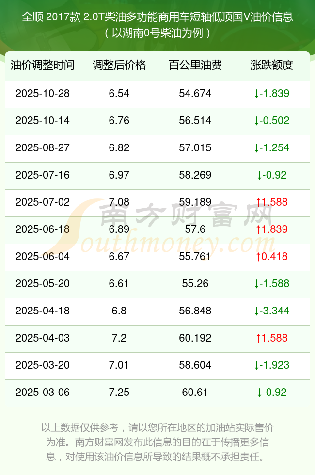 根據(jù)10月28日0號柴油最新調(diào)整價格6.54元/升來計算(以湖南為例),該車型每百公里的平均油費(fèi)是54.674元,上一輪10月14日調(diào)整價格6.76元每升來計算,每百公里的平均油費(fèi)是56.514元,對比上一輪少花1.839元,下一輪的油價調(diào)整時間是11月10日24時。