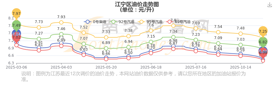 江寧區(qū)汽油、柴油11月8日每升的價格(油價調(diào)整時間10月28日):92號汽油6.82元;95號汽油7.25元;89號汽油6.39元;0號柴油6.44元。