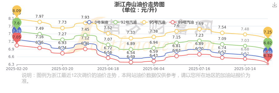 11月8日浙江舟山汽油、柴油每升價格詳情為:92號汽油為6.82元,下跌了0.21元;95號汽油為7.25元,下跌了0.23元;89號汽油為6.32元,下跌了0.2元;0號柴油為6.46元,下跌了0.22元,本次油價調(diào)整時間為10月28日。