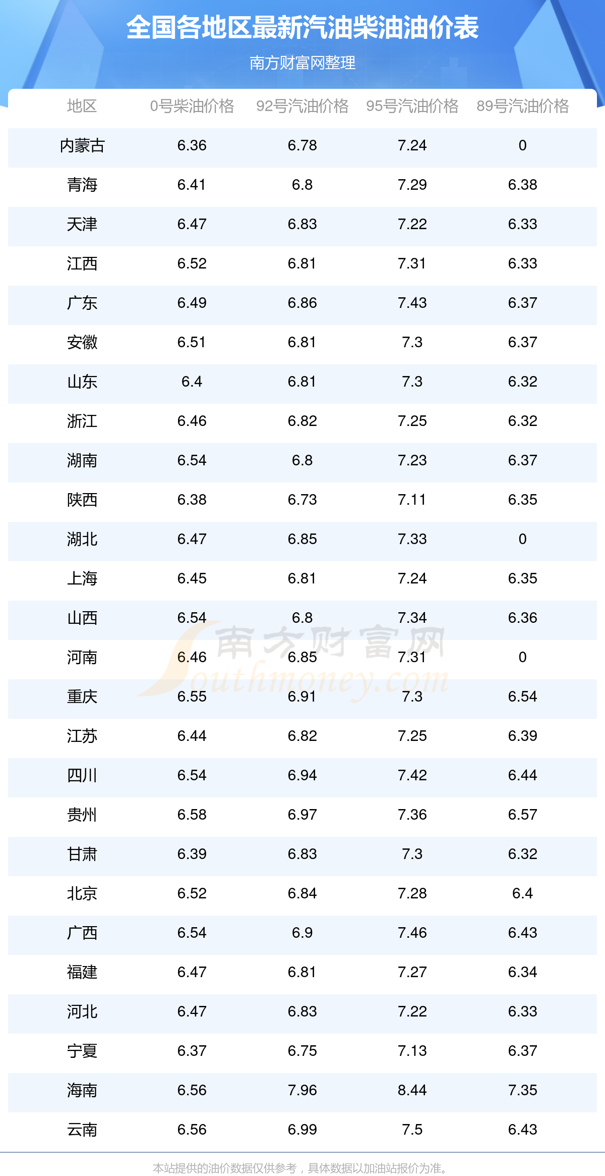 全國(guó)各地區(qū)2025年最新油價(jià)表