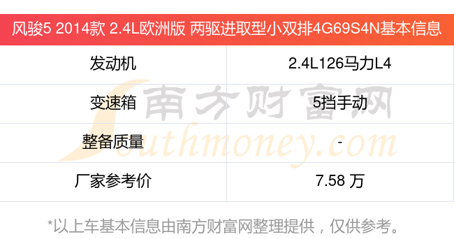 風(fēng)駿5 2014款 2.4L歐洲版 兩驅(qū)進(jìn)取型小雙排4G69S4N動力方面,搭載的是一臺2.4L126馬力L4自然吸氣發(fā)動機(jī),匹配5擋手動擋變速箱,燃料形式為汽油,廠家參考價7.58萬元。