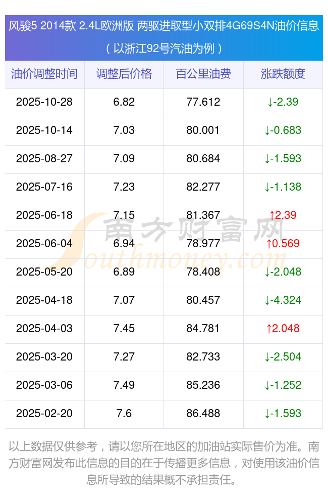 依照10月28日92號汽油最新調(diào)整價格6.82元/升來計算(以浙江為例),該車型百公里的平均油費(fèi)是77.612元,依照上一輪10月14日調(diào)整價格7.03元/升來計算,百公里的平均油費(fèi)是80.001元,對比上一輪少花2.39元,下一輪的油價調(diào)整時間11月10日24時。