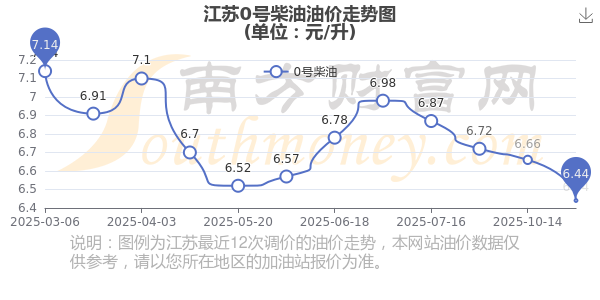 11月8日,江蘇0號柴油的價格是6.44元每升,本次的調(diào)整時間為10月28日,對比上次的調(diào)整下跌了0.22元,下跌3.303%,下次調(diào)整時間為11月10日24時,還有2.51天。