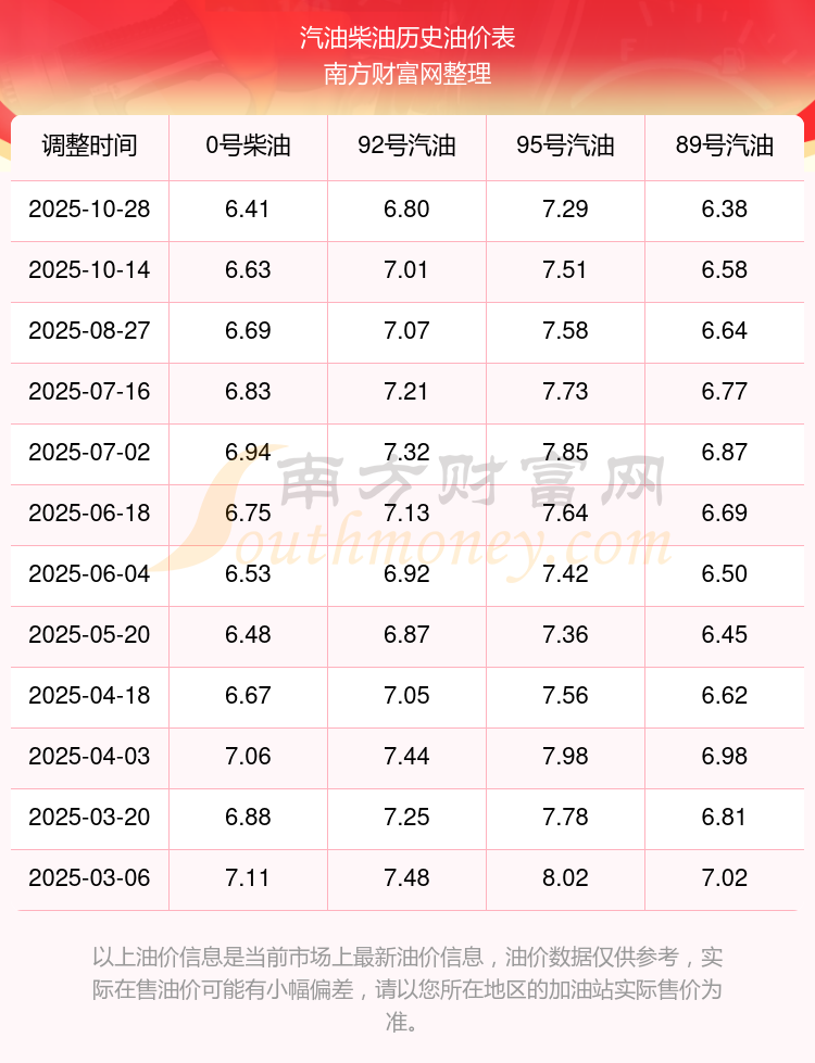 11月8日,青海西寧汽油、柴油每升的價格是多少?本次油價調整時間是10月28日,92號汽油為6.8元,降了0.21元,降幅達3%;95號汽油為7.29元,降了0.22元,降幅達2.93%;89號汽油為6.38元,降了0.2元,降幅達3.04%;0號柴油為6.41元,降了0.22元,降幅達3.32%。下一輪油價調整時間11月10日24時,距離現(xiàn)在還有2.51天。
