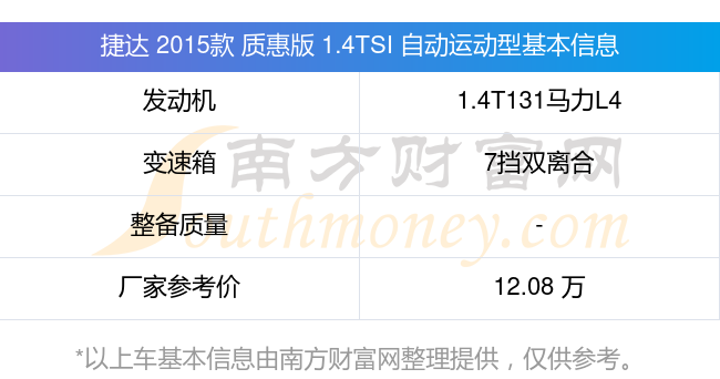 捷達(dá) 2015款 質(zhì)惠版 1.4TSI 自動(dòng)運(yùn)動(dòng)型動(dòng)力方面,搭載的是一臺(tái)1.4T131馬力L4渦輪增壓發(fā)動(dòng)機(jī),匹配7擋雙離合自動(dòng)檔變速箱,燃料形式為汽油,廠家參考價(jià)12.08萬元。