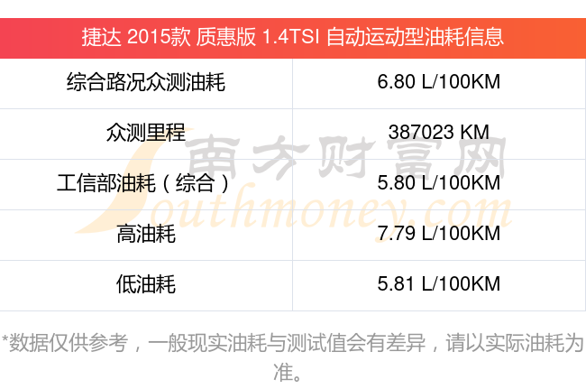 根據(jù)多位車主實(shí)測(cè)得出數(shù)據(jù),該車型低油耗為5.81L/100km,高油耗為7.79L/100km,綜合路況眾測(cè)油耗為6.80L/100km,工信部綜合油耗為5.80L/100km。