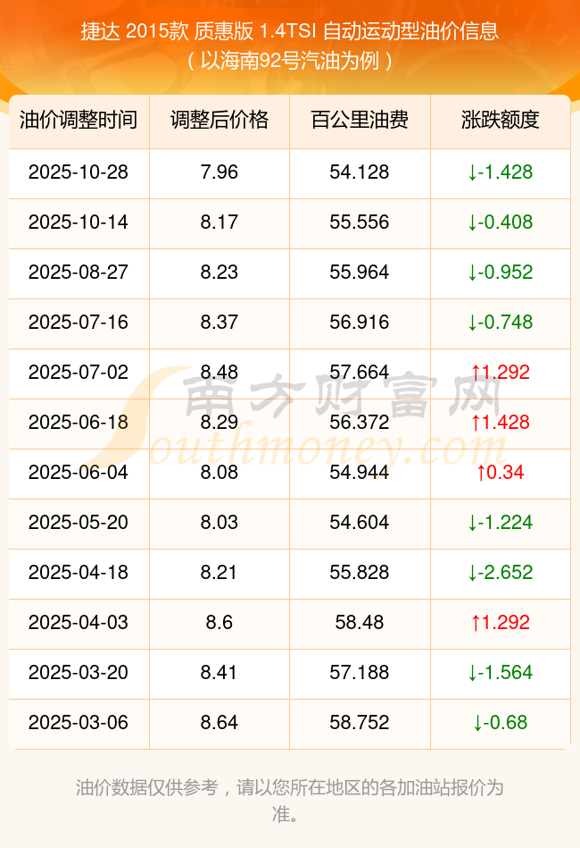依照10月28日92號(hào)汽油最新調(diào)整價(jià)格7.96元/升來計(jì)算(以海南為例),該車型百公里的平均油費(fèi)是54.128元,依照上一輪10月14日調(diào)整價(jià)格8.17元/升來計(jì)算,百公里的平均油費(fèi)是55.556元,對(duì)比上一輪少花1.428元,下一輪的油價(jià)調(diào)整時(shí)間11月10日24時(shí)。