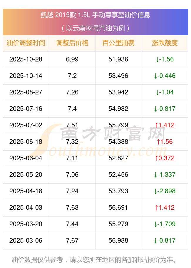 按10月28日92號汽油最新調整價格6.99元每升來計算(以云南為例),該車型百公里平均油費為51.936元,按上一輪10月14日調整價格7.2元每升來計算,百公里平均油費為53.496元,對比上一輪少花1.56元,下一輪油價調整時間為11月10日24時。