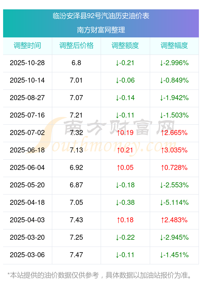 11月8日臨汾安澤縣92號(hào)汽油歷史油價(jià)一覽表