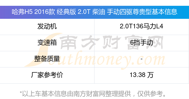 哈弗H5 2016款 經(jīng)典版 2.0T 柴油 手動(dòng)四驅(qū)尊貴型動(dòng)力上搭載的是一臺(tái)2.0T136馬力L4渦輪增壓發(fā)動(dòng)機(jī),匹配6擋手動(dòng)擋變速箱,燃料形式為柴油,廠家參考價(jià)13.38萬(wàn)元。