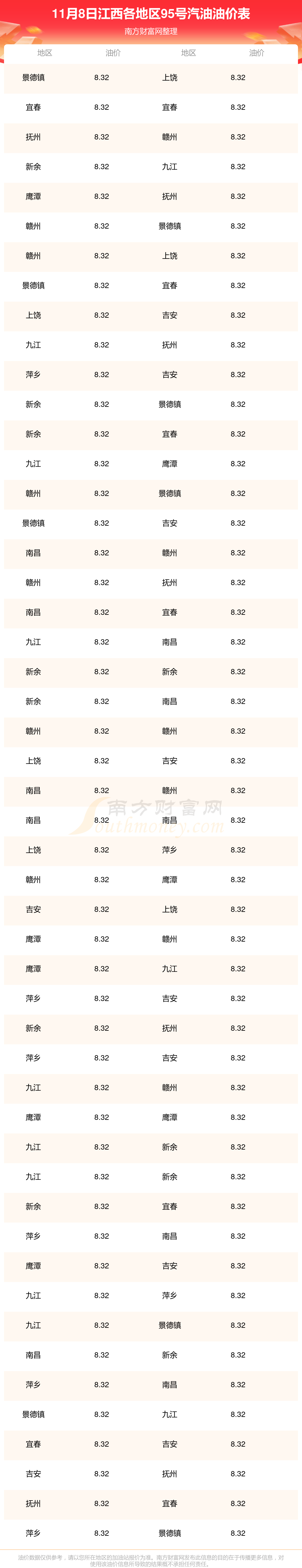 2025年11月8日江西95號(hào)汽油最新價(jià)格一覽表