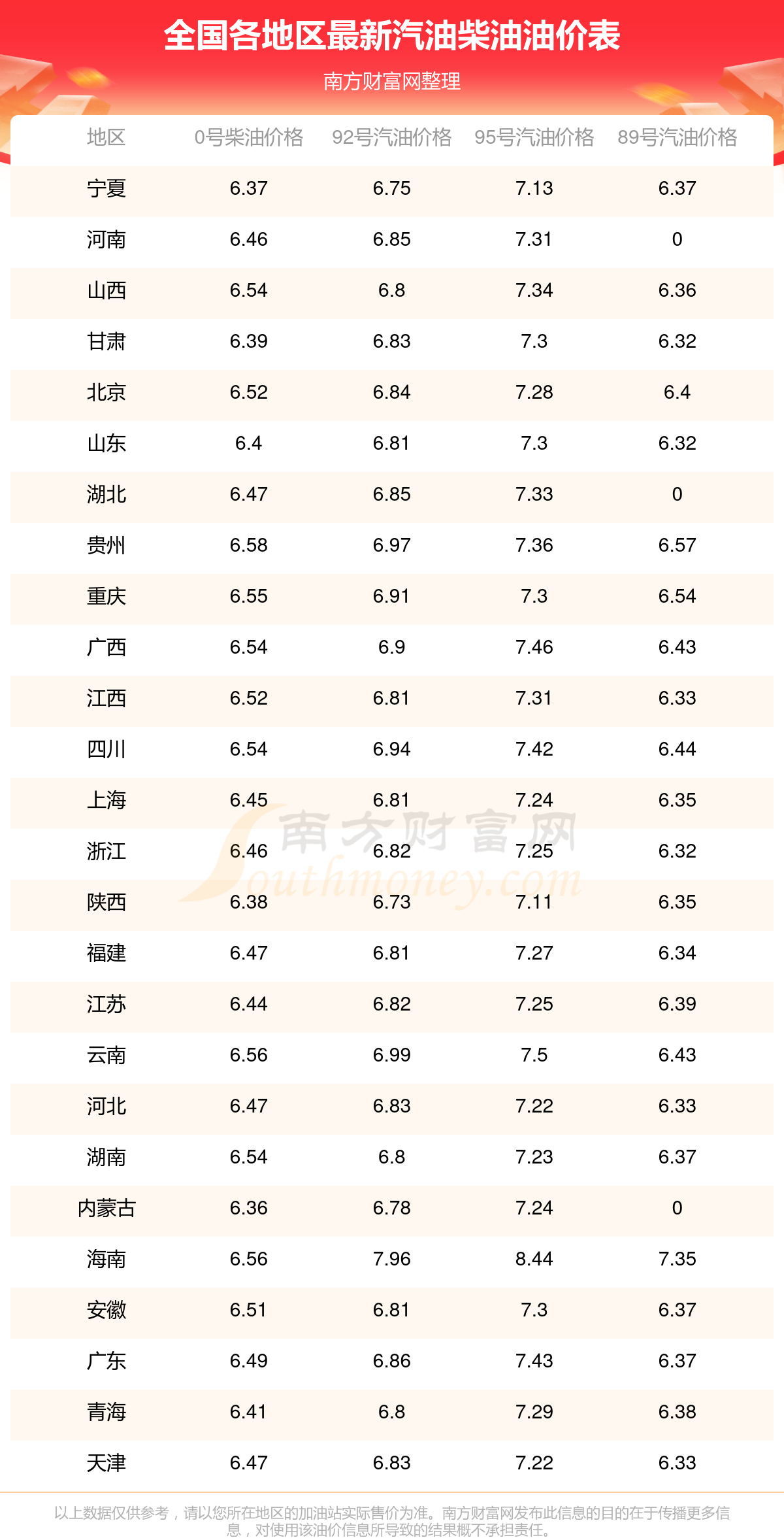 以上數(shù)據(jù)僅供參考,請(qǐng)以您所在地區(qū)的加油站實(shí)際售價(jià)為準(zhǔn)。南方財(cái)富網(wǎng)發(fā)布此信息的目的在于傳播更多信息,對(duì)使用該油價(jià)信息所導(dǎo)致的結(jié)果概不承擔(dān)責(zé)任。