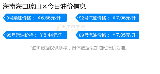 11月8日海南海口瓊山區(qū)汽油、柴油的價格是10月28日調(diào)整后的價格,每升價格為:92號汽油為7.96元,下調(diào)了0.21元,下調(diào)幅達2.57%;95號汽油為8.44元,下調(diào)了0.23元,下調(diào)幅達2.65%;89號汽油為7.35元,下調(diào)了0.19元,下調(diào)幅達2.52%;0號柴油為6.56元,下調(diào)了0.22元,下調(diào)幅達3.25%。