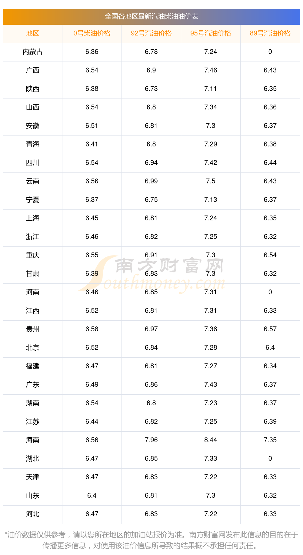 全國各地區(qū)2025年最新油價表