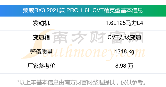 榮威RX3 2021款 PRO 1.6L CVT精英型搭載了一臺(tái)1.6L125馬力L4自然吸氣發(fā)動(dòng)機(jī),采用CVT無(wú)級(jí)變速自動(dòng)檔變速箱,常規(guī)整備質(zhì)量1318kg,廠家參考價(jià)8.98萬(wàn)元。