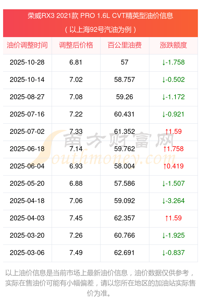 根據(jù)10月28日92號(hào)汽油最新調(diào)整價(jià)格6.81元/升來(lái)計(jì)算(以上海為例),該車(chē)型每百公里的平均油費(fèi)是57元,上一輪10月14日調(diào)整價(jià)格7.02元每升來(lái)計(jì)算,每百公里的平均油費(fèi)是58.757元,對(duì)比上一輪少花1.758元,下一輪的油價(jià)調(diào)整時(shí)間是11月10日24時(shí)。
