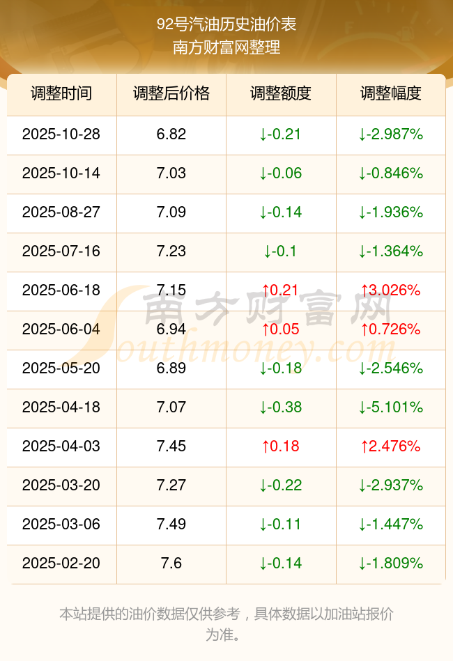 汽油、柴油11月8日每升最新價(jià)格:92號(hào)汽油為6.82元;95號(hào)汽油為7.25元;89號(hào)汽油為6.32元;0號(hào)柴油為6.46元,本輪油價(jià)調(diào)整時(shí)間為10月28日。下一輪油價(jià)調(diào)整時(shí)間11月10日24時(shí),距離現(xiàn)在還有2.47天。
